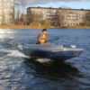 При этом есть ещё очень важное отличие от известных конструкций НДНД которое присуще всем двухкорпусным лодкам, это баллоны. В двухкорпусном судне баллон может быть органичен минимальным диаметром, который необходим для установки банок в кокпит. Как правило, для удобства, банки устанавливают на высоту 400 мм от палубы, соответственно баллон может быть диаметром не менее 400мм. При этом внешние габариты лодки остаются узнаваемыми, например 1800 мм. Ширина кокпита увеличивается и становится 900 -1000 мм. В известных конструкциях надувных лодок ширина кокпита лодки примерно 800-840 мм. Так как конуса баллонов в двухкорпусном судне не играют никакой роли, они находятся всегда выше ватерлинии судна, от них можно вообще избавиться и производить баллоны с торцевой заглушкой. Это приводит к увеличению полезной длины кокпита. При ширине днища 1700 мм, устойчивость лодки уникальна, в поворотах боковой крен незначительный.
